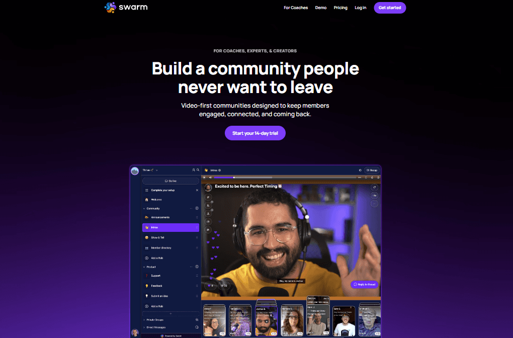 Swarm focuses on including video-based connections in their communities for this reason. This can mean live sessions with embedded replays or rich asynchronous video discussions. By structuring conversation around faces and voices, rather than text alone, Swarm aims to create deeper engagement and more authentic interaction.