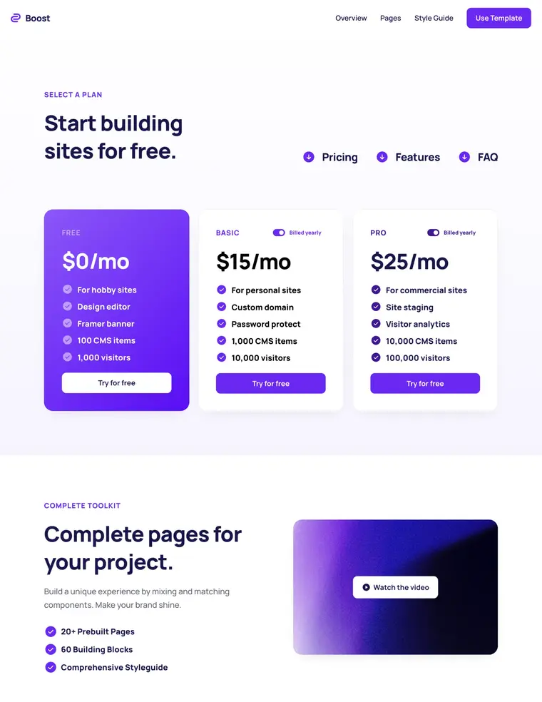 Choose from 20+ pages from various categories. Customize your page, hit publish and instantly see your site live.